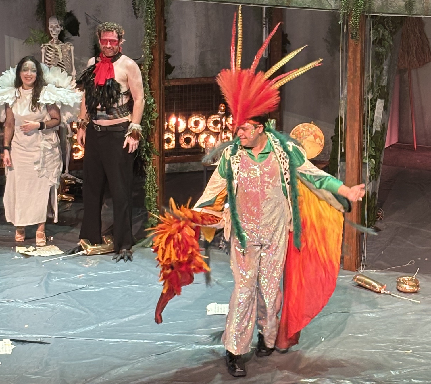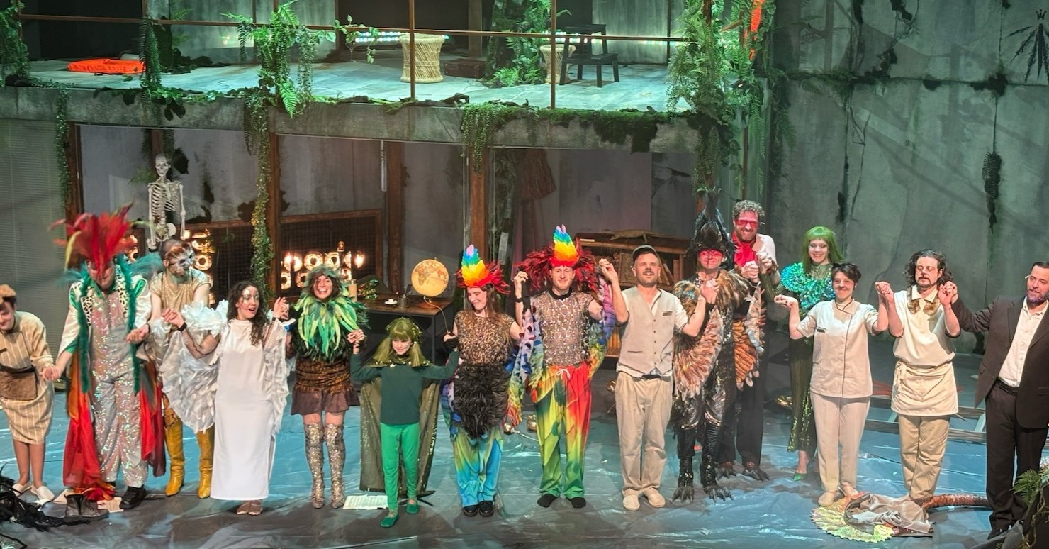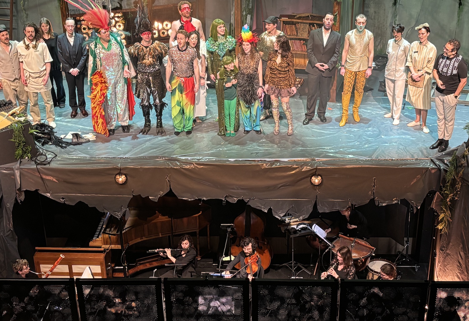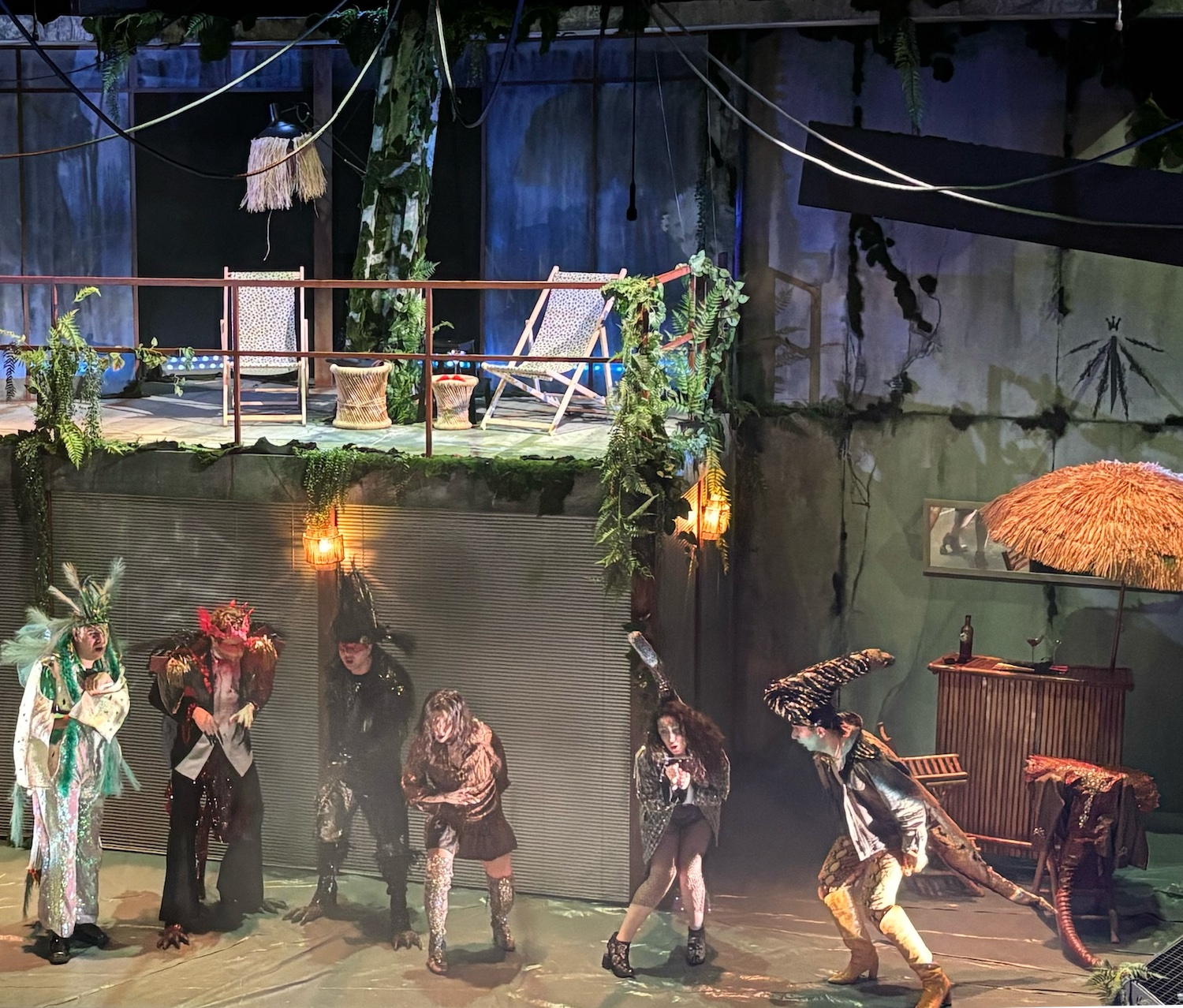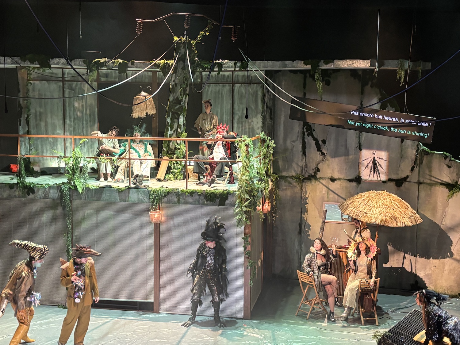 Acte I : Le monde des Sauriens. Tyrannosaurus Rex, roi vaniteux, règne sur une société frivole et décadente. Est-ce qu’ils vont manquer leur embarquement sur la Noé ? Est-ce qu’ils vont trouver un moyen pour survivre le déluge? En magnifique costumes dans une scène qui se transforme de terrasse d’un immeuble à une arche. Des pylônes électriques effondrés témoignent d’une humanité déchue.