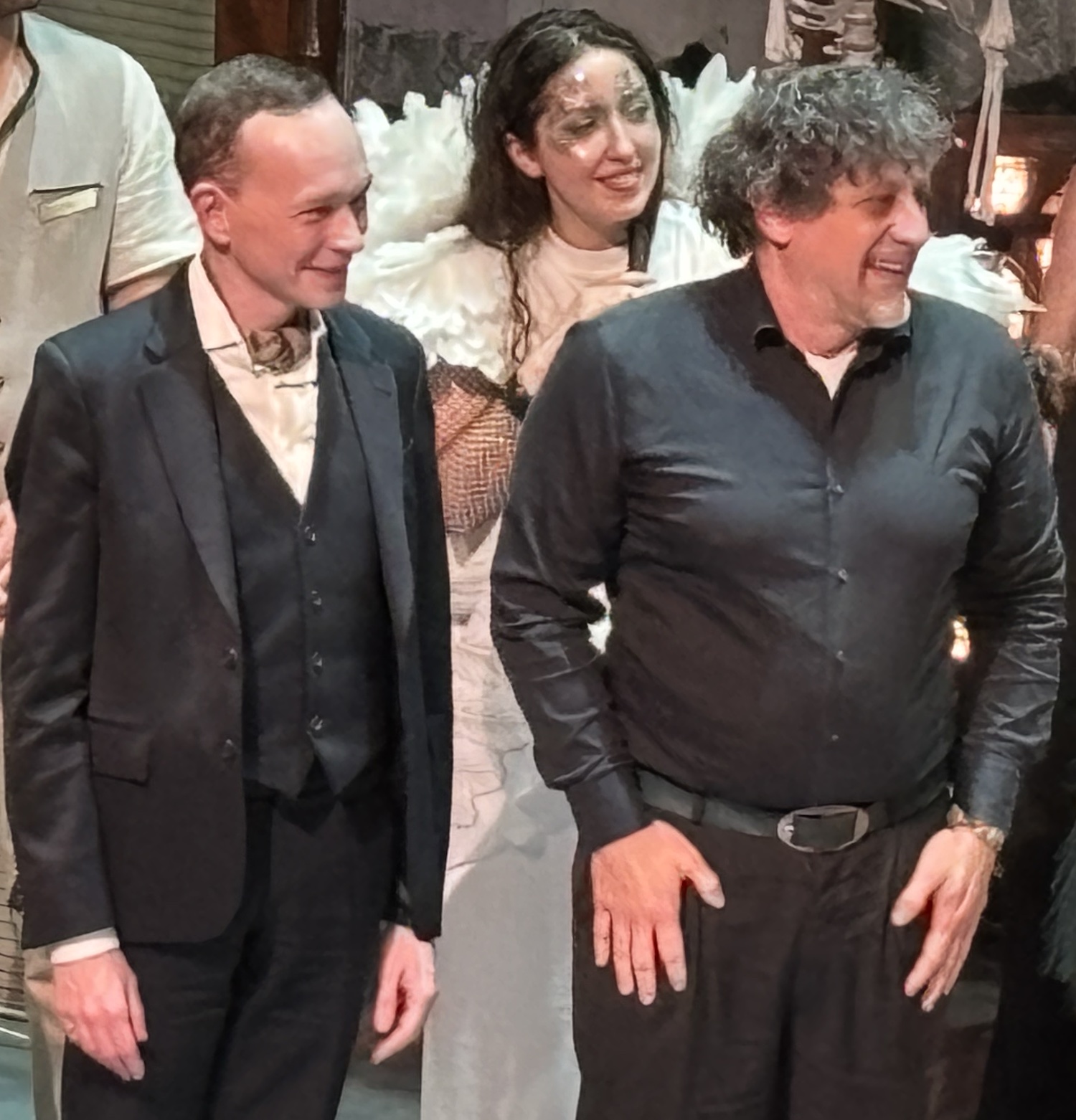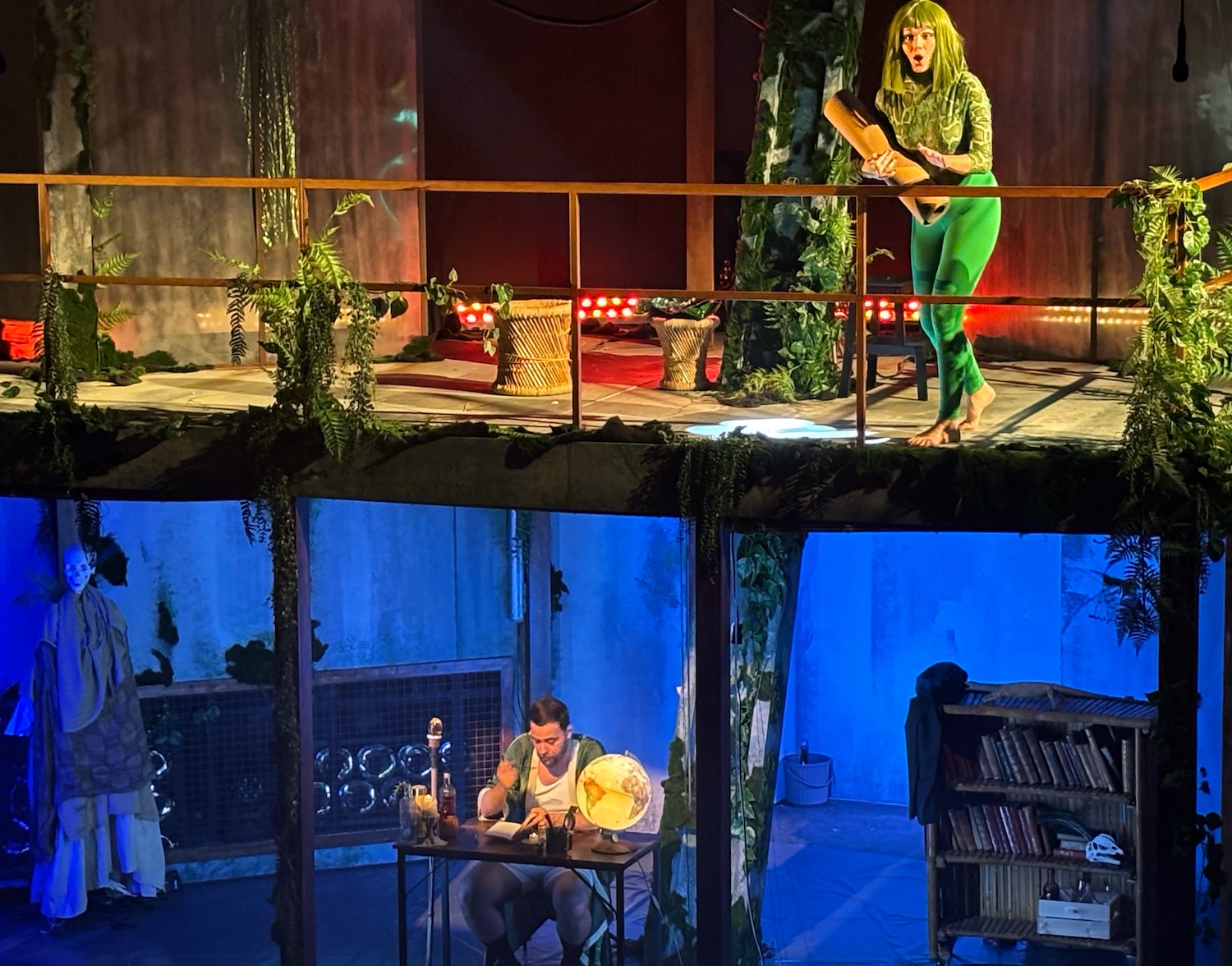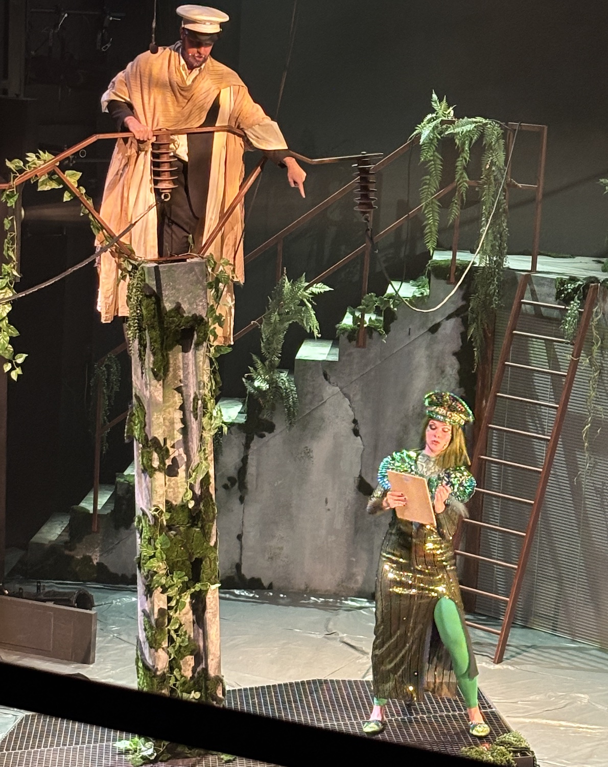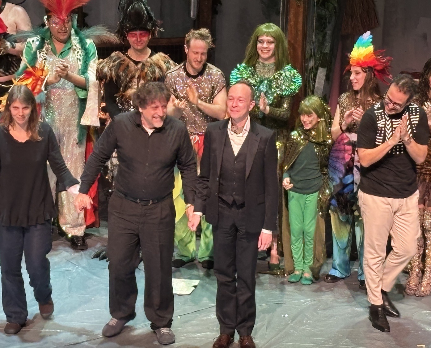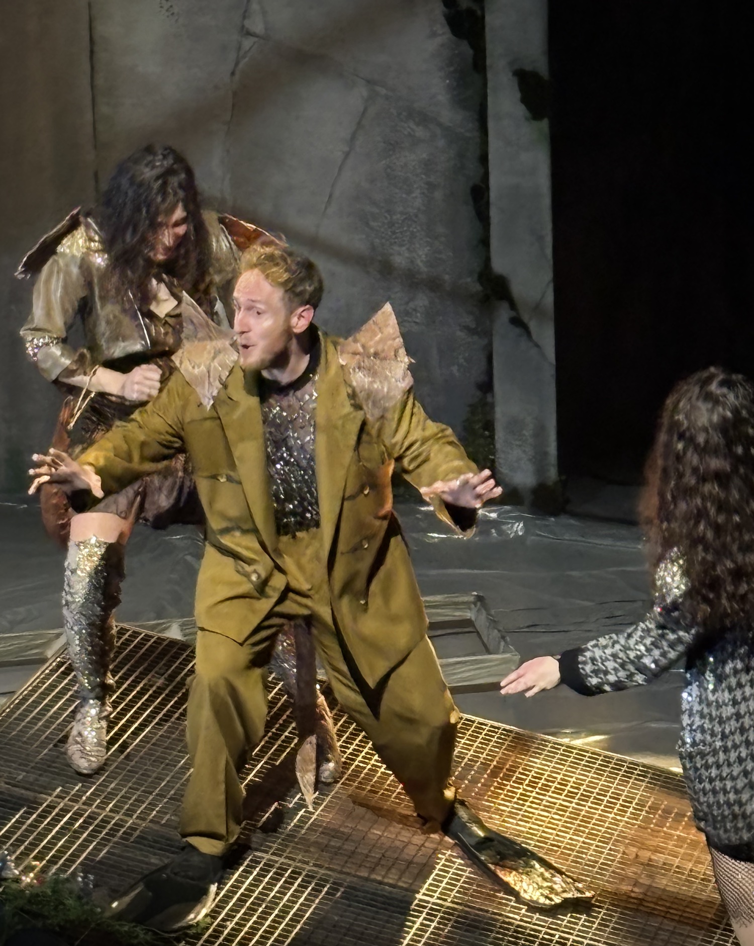 Acte I : Le monde des Sauriens. Tyrannosaurus Rex, roi vaniteux, règne sur une société frivole et décadente. Est-ce qu’ils vont manquer leur embarquement sur la Noé ? Est-ce qu’ils vont trouver un moyen pour survivre le déluge? En magnifique costumes dans une scène qui se transforme de terrasse d’un immeuble à une arche. Des pylônes électriques effondrés témoignent d’une humanité déchue.