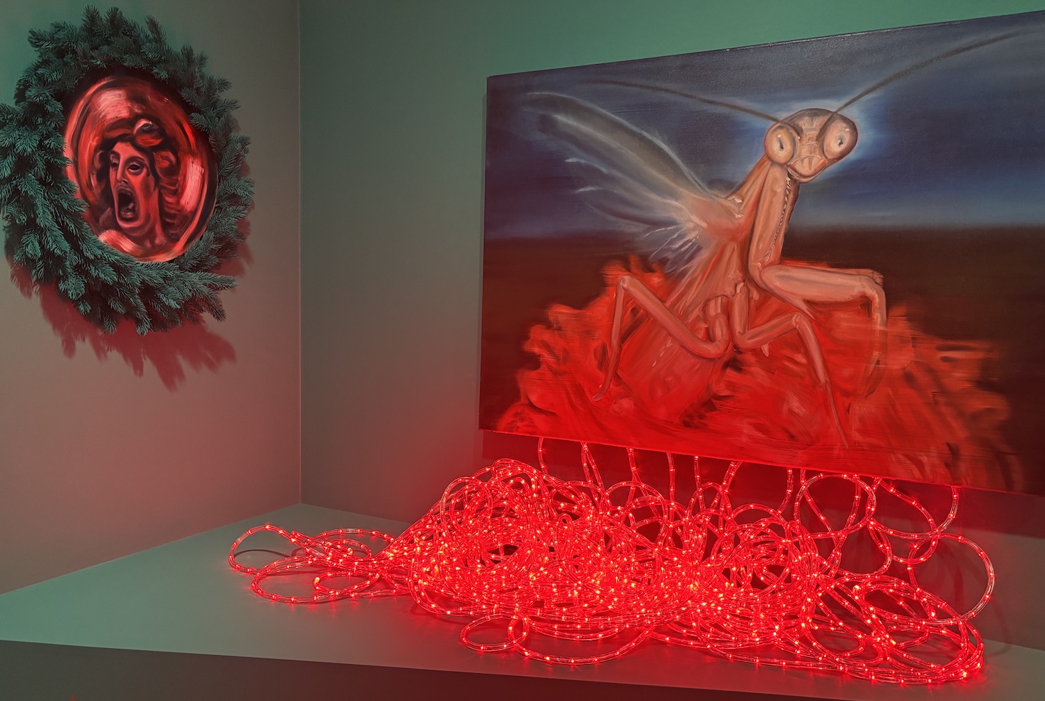 Anges à l’infini s’enrichit du regard contemporain de trois artistes actives dans le canton de Fribourg. Au travers d’œuvres inédites, spécialement conçues pour l’exposition, chacune explore la figure angélique jusqu’à son double démoniaque. Tout en douceur, la série photographique de Diane Deschenaux invite à contempler l’immensité céleste à la recherche des anges que l’on imagine volontiers blottis dans de cotonneuses nuées. À l’inverse, Anja Jenny bouscule les codes de l’iconographie sacrée en créant une figure hybride et irrévérencieuse, où le divin se dissout dans le kitsch assumé des célébrations hivernales. Maria Eugenia Poblete puise dans la spiritualité des Andes, dont elle est originaire, et donne à voir Supay (aussi appelé el Tío, l’Oncle), une puissance cachée qui soutient la vie depuis le monde souterrain où elle réside. En Bolivie, au Pérou et au nord du Chili, cette force invisible est vénérée lors de la Diablada. Dans de cette danse traditionnelle du Carnaval, deux groupes d’entités spirituelles se font face : des diables et des anges.