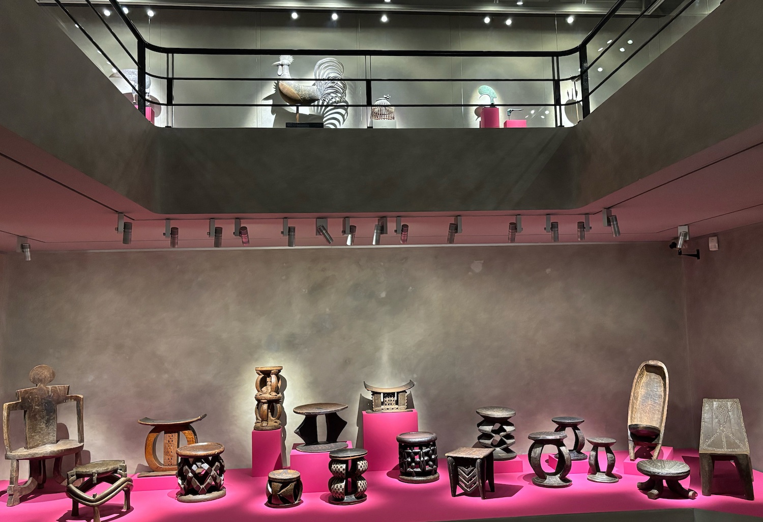 Dès l’entrée, une assemblée de sièges, en provenance du continent africain et fabriqués dans un seul bloc de bois.