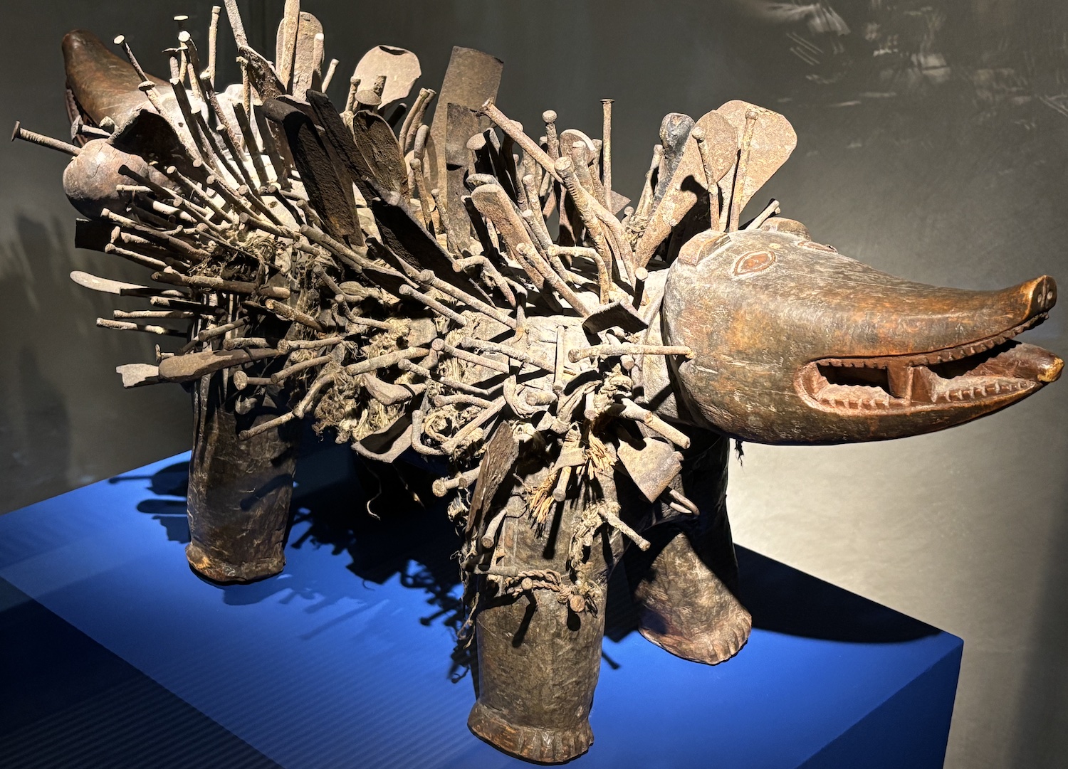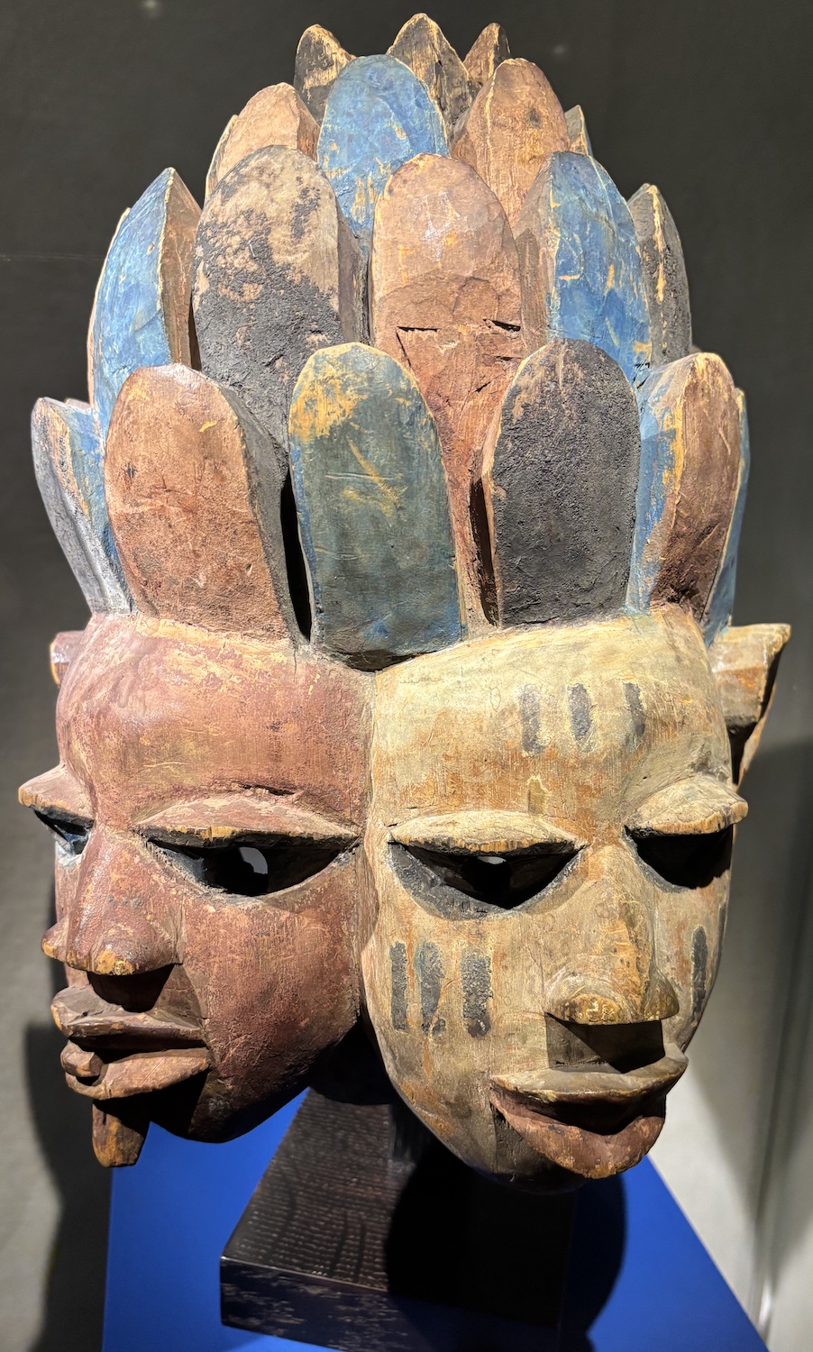 Le thème du double traverse l’exposition. Les oeuvres explorent diverses formes de dualité. Dans le couloir, le masque à double visage gelede, Yoruba, Nigeria, en bois dur polychrome et Objet-force zoomorphe bicéphale de la République démocratique du Congo, bois, clous, fer, tissu.