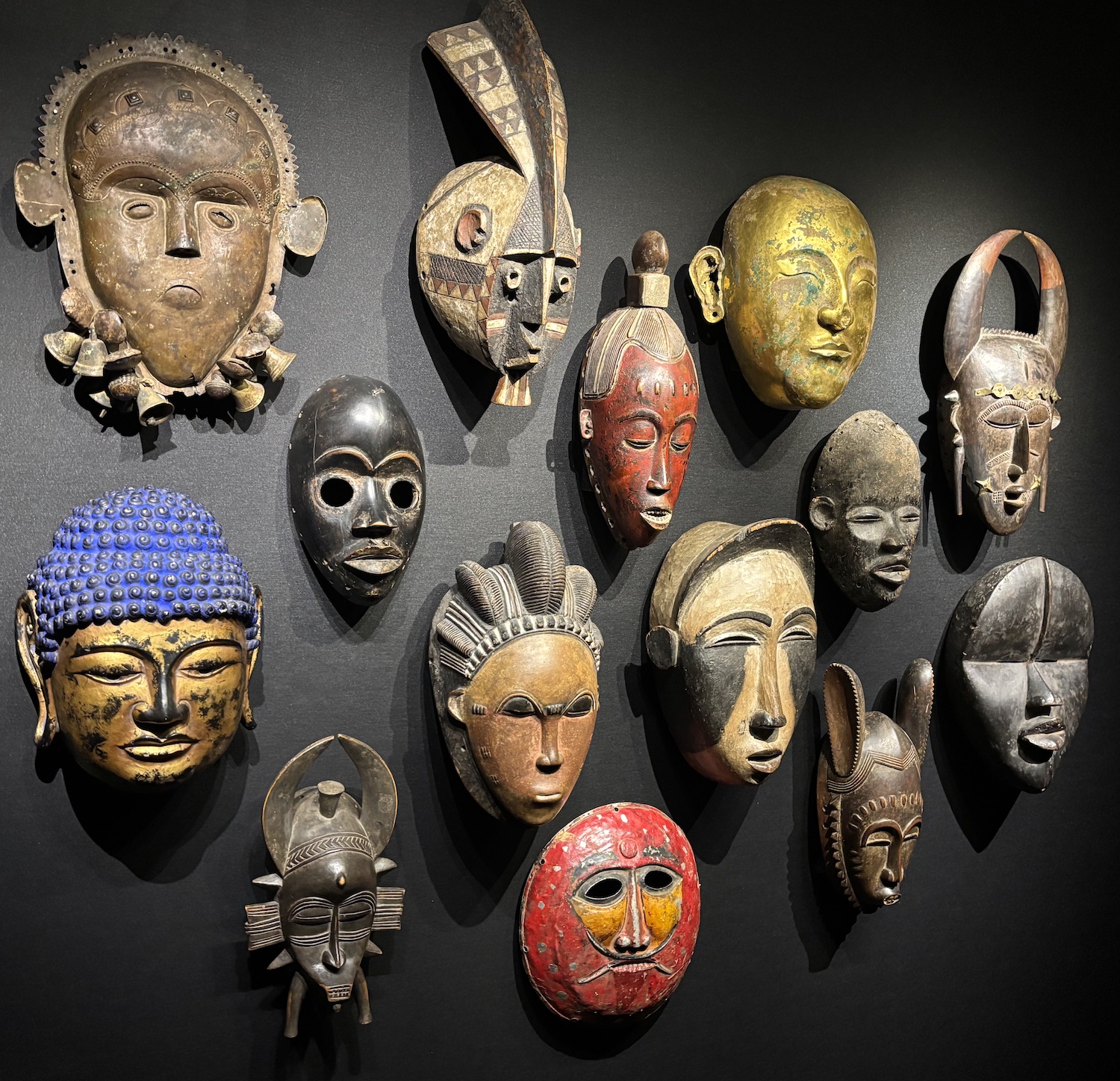 Les masques rassemblés dans la petite salle, en provenance de Chine, du Népal, du Japon, de Côte d’Ivoire ou encore de République Démocratique du Congo sont présentés comme une constellation de visages surgissant d’un monde des esprits.