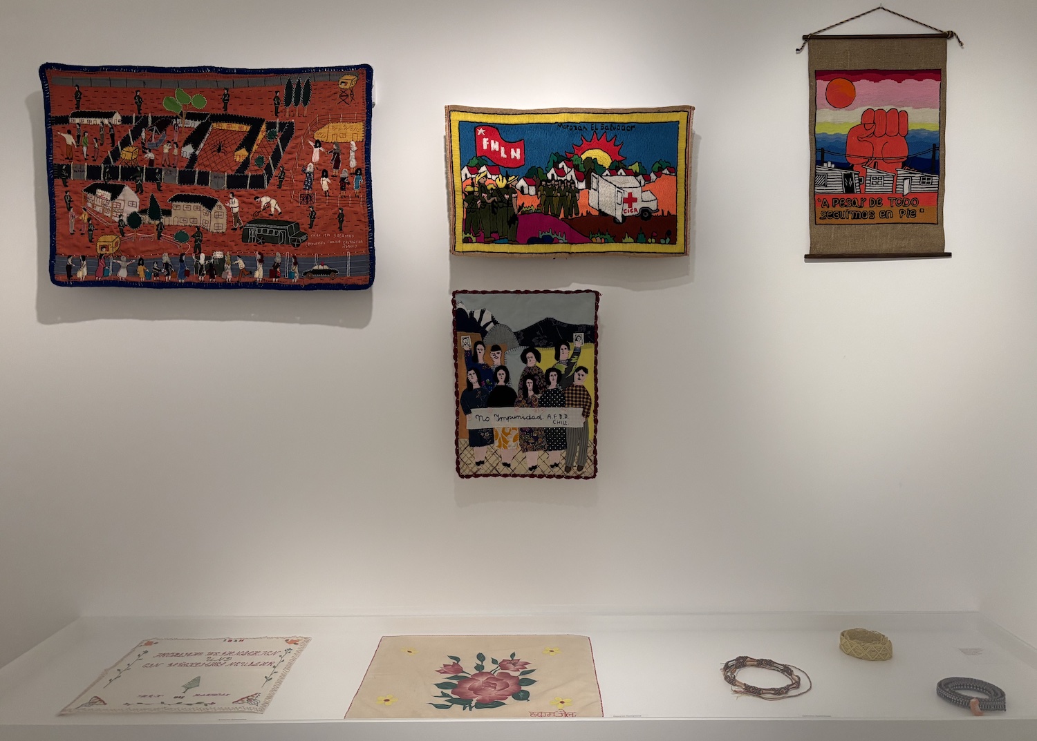 Un espace est dédié au travail des déléguées de la Croix Rouge international. Dans la vitrine des oeuvres tissés fabriqués par des prisonniers de guerre, de conflit.