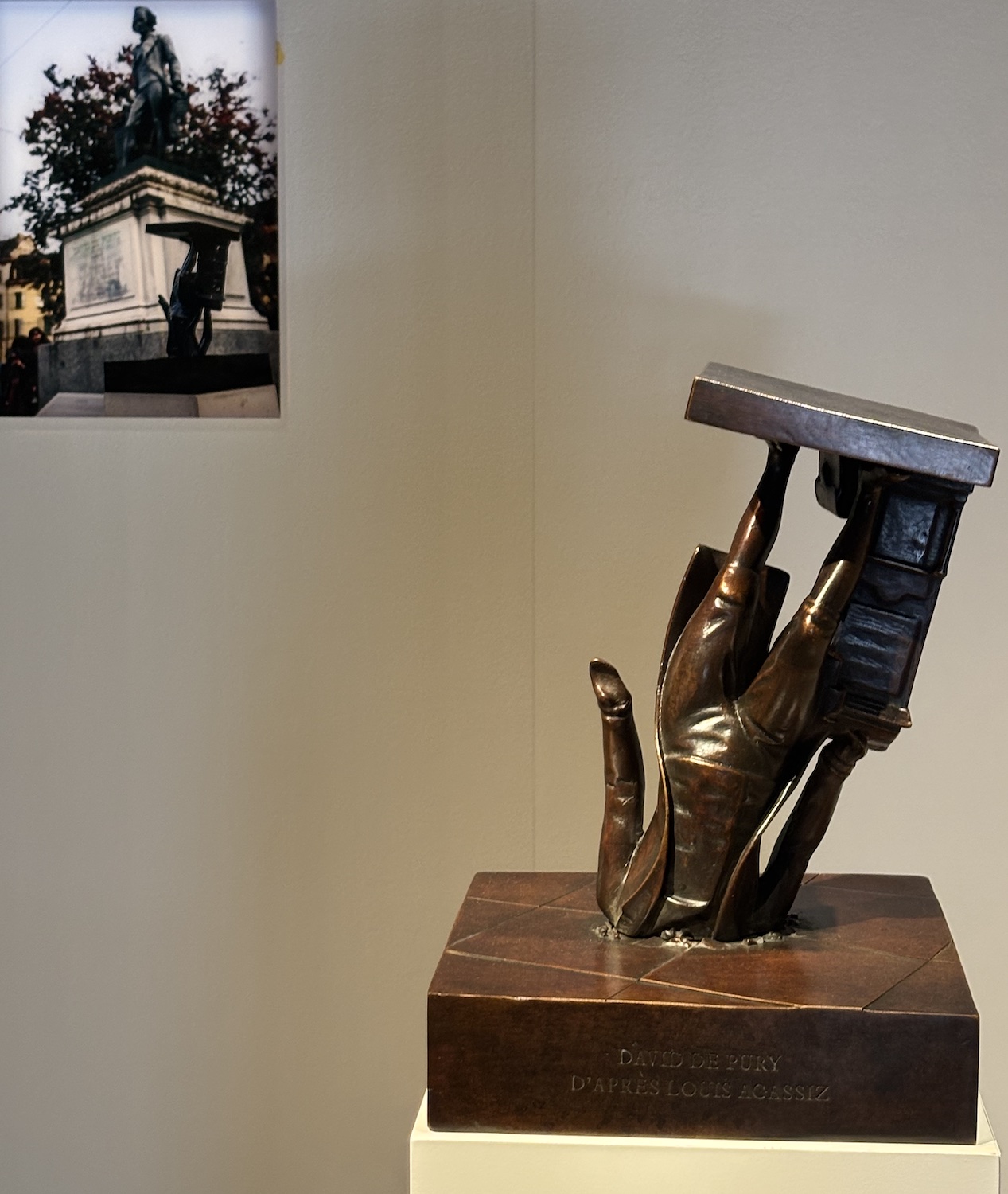 La sculpture en bronze de l’artiste genevois Mathias C. Pfund – il s’agit d’une miniature renversée de la statue représentant David de Pury, commerçant neuchâtelois impliqué dans le commerce de personnes esclavagisées au 18e siècle – illustre le débat actuel sur la présence dans l’espace public de monuments représentant des personnalités liées au passé colonial. Cette question constitue le fil rouge de la dernière partie de l’exposition. Celle-ci présente les conséquences du colonialisme jusqu’à l’époque contemporaine et les débats qui en résultent. Elle s’interroge sur la signification de l’héritage colonial pour la Suisse d’aujourd’hui.