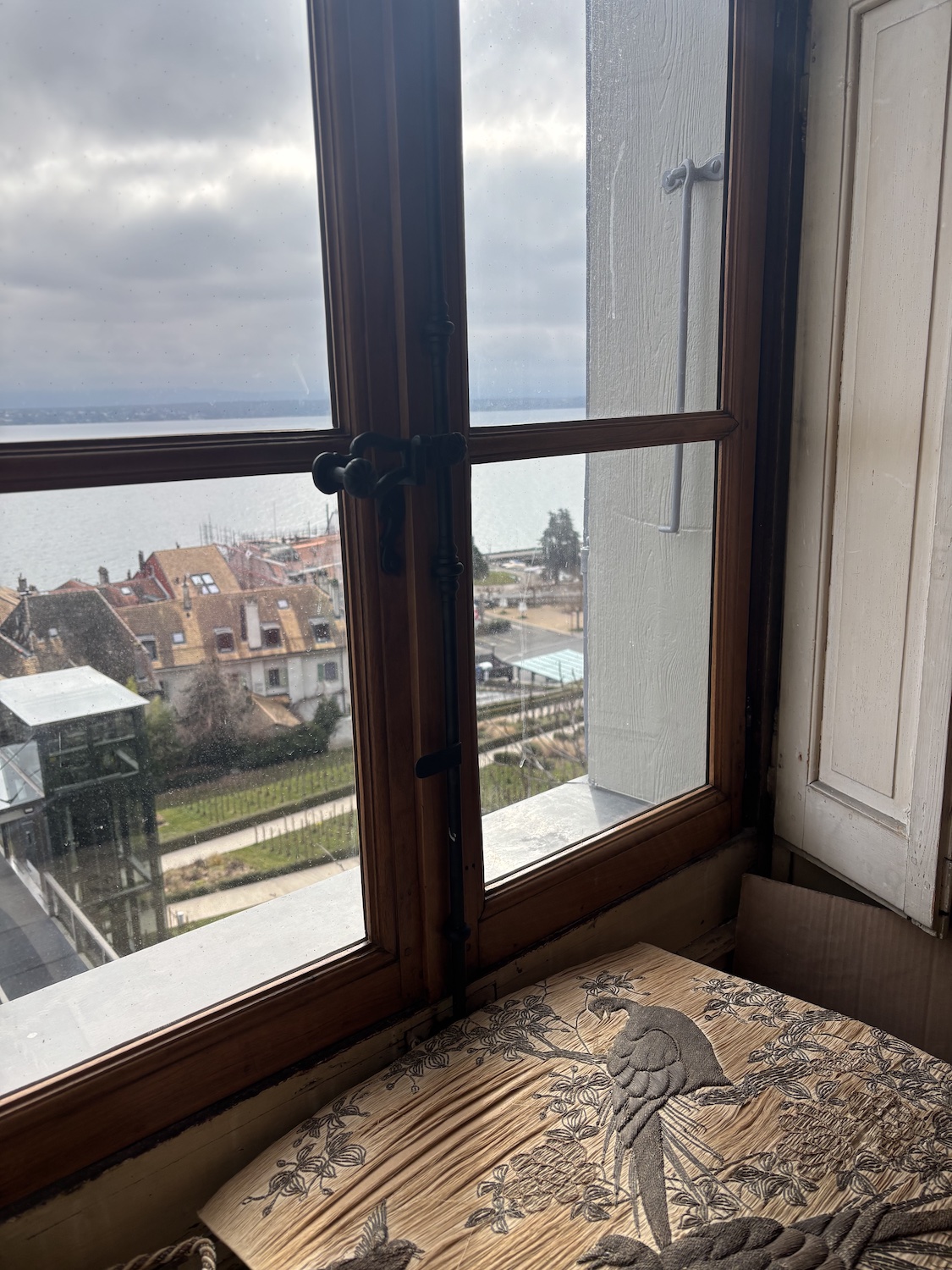 Fenêtre avec double vitrage avec vue sur le lac. Les radiateurs, reliés à une future pompe à chaleur, vont être mis à l’intérieur de la poële