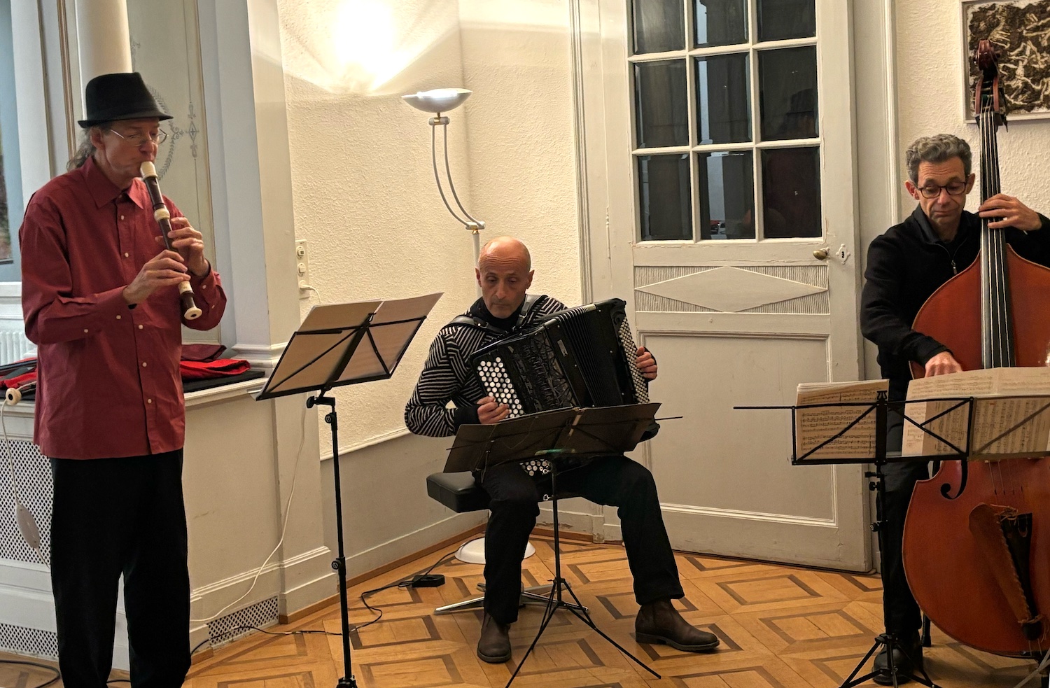 François Mützenberg, président du comité de la Villa Dutoit. Concert de musique traditionnelle de Suisse romande (Genève, Vaud, Valais, Fribourg), sous la direction de François Mützenberg, flûtes à bec, accompagné de ses complices de l’ensemble Zône franche: Jean-Luc Manca, accordéon et Olivier Destephany, contrebasse. Un moment pour chanter l’Escalade avec ses chansons les plus connues (Cé qu’è lainô et autres).